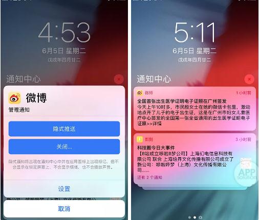 此外,你還可以對應用設置「隱式推送」,被設置應用的新消息推送將只會(huì )在通知欄上出現,雖然會(huì )顯示消息角標,但不會(huì )出現在鎖屏上,也不會(huì )顯示橫幅或播放聲音。