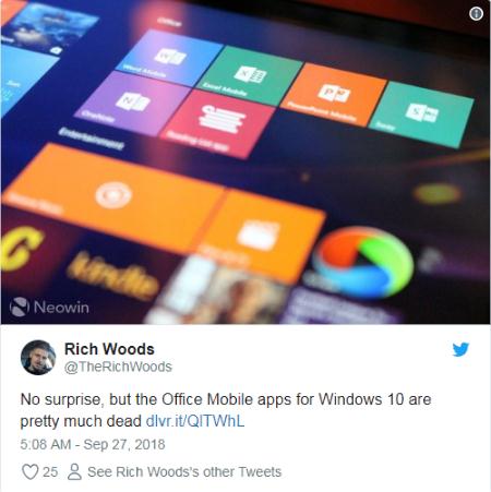 在外媒 Neowin 編輯 Rich Wood 于 Twitter 上爆料之后,有關(guān)微軟將要放棄 Office Mobile 應用的消息迅速發(fā)酵。他在推文中寫(xiě)到:“毫不奇怪,但 Windows 10 Office Mobile 應用算是走到盡頭了”。他從一位參加了微軟 Ignite 2018 技術(shù)大會(huì )的消息人士處獲悉,其在會(huì )后立即與 Office 團隊進(jìn)行了探討,后者透露該公司將把 Windows 10 Office Mobile 打入冷宮(被視為“遺留軟件”/ Legacy Software)。