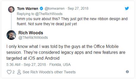 這位消息人士稱(chēng):“我在 Office Mobile 子會(huì )場(chǎng)被告知,它們已經(jīng)被視為‘遺留軟件’,新功能將只面向 iOS 和 Android 作”。