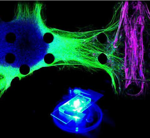 “芯片器官”:綠色部分為漸凍癥患者誘導性多能干細胞分化而成的運動(dòng)神經(jīng)元,紫色部分為肌肉組織。