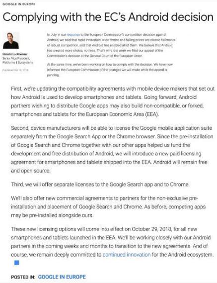 我們在 7 月對歐盟委員會(huì )針對 Android 的競爭決策的回應中,表示快速創(chuàng )新,提供廣泛選擇和下降價(jià)格是強勁競爭的經(jīng)典手段,并且 Android 已經(jīng)啟用了這些手段。我們相信 Android 為消費者提供了更多選擇。因此,我們于上周向歐盟總法院提交了委員會(huì )決定的上訴。