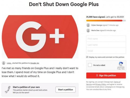 10 月上旬,谷歌官方博客透露公司將在未來(lái) 10 個(gè)月內關(guān)閉 Google+ 的消費者版本。公司稱(chēng)目前 Google+ 的“使用率和參與度都很低”,90% 的 Google+ 用戶(hù)會(huì )話(huà)持續時(shí)間不到 5 秒。不過(guò)一批忠實(shí)擁躉在 Change.org 平臺上發(fā)起請愿,要求這個(gè)經(jīng)常被嘲笑的社交網(wǎng)絡(luò )平臺繼續存在,目前已經(jīng)有超過(guò) 31000 人簽名,要求延長(cháng) Google+ 的生命線(xiàn)。