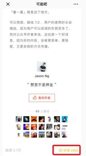 原先存在于文章底部右下方的“點(diǎn)贊”功能被替換為“好看”。需要注意的是,經(jīng)過(guò)測試,該功能只適用于微信 7.0 版本發(fā)版之后,所發(fā)布的新文章。發(fā)版時(shí)間點(diǎn)之前,更新的文章底部依舊是“點(diǎn)贊”功能。