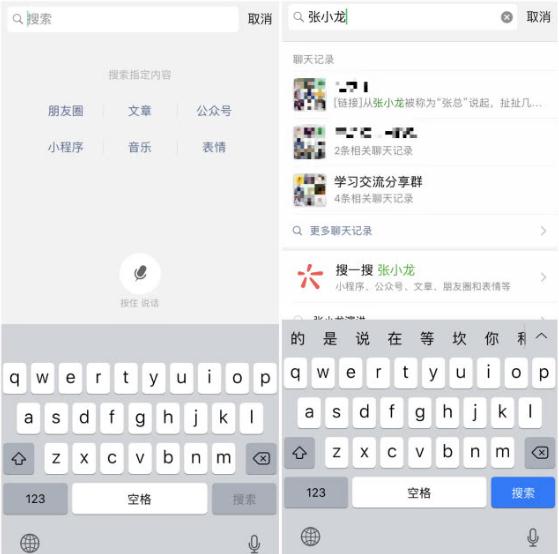 在之前版本的微信中,只允許用戶(hù)在搜索框內進(jìn)行文字搜索,7.0 版本中出現“語(yǔ)音”功能鍵: