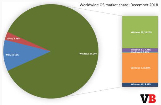 在 2018 年 12 月,Windows 的市場(chǎng)份額整體下滑了 0.83 個(gè)百分點(diǎn),下滑到了 86.20%。相對而言,在 2017 年 12 月,Windows 的市場(chǎng)份額是 88.51%。