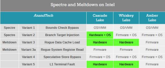修復這些漏洞的方式也不同,有的是需要通過(guò)操作系統打補丁,還有的需要英特爾升級處理器的 MCU 微代碼,最根本的手段則是物理修復,那就是在新一代處理器上修復漏洞。對于這個(gè)問(wèn)題,英特爾去年 8 月份開(kāi)始已經(jīng)在 Whisky Lake 處理器、Cascade Lake 處理器上使用物理修復的手段了,修復了熔斷漏洞的一些變種。
