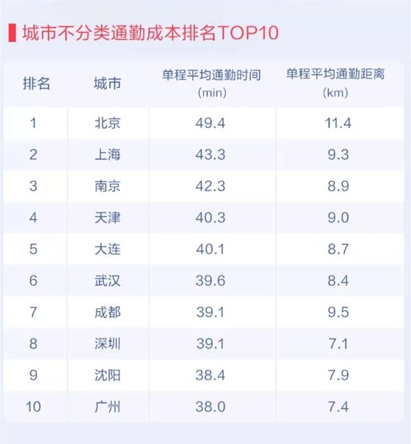 其中,北京單程平均通勤時(shí)間為 49.4 分鐘,單程平均通勤距離為 11.4 公里,遠超其他城市。