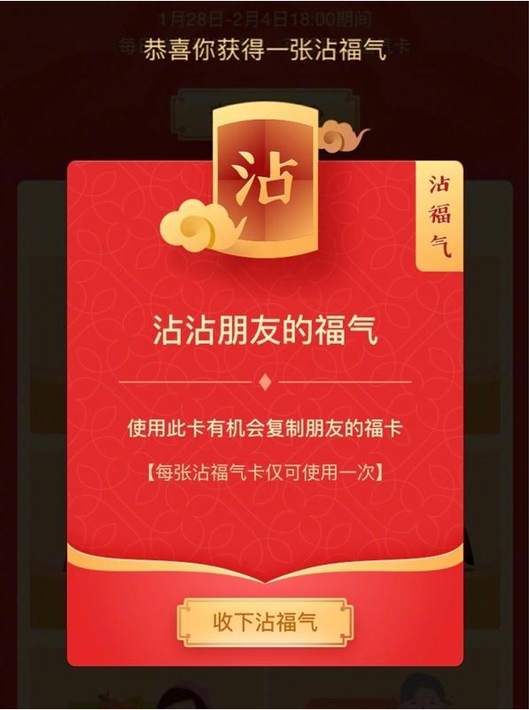 沾福氣卡的獲取方式說(shuō)來(lái)也簡(jiǎn)單,就是掃福,或者到店支付寶消費,都有機會(huì )獲取,但是這個(gè)幾率嘛……就看你有沒(méi)有錦鯉的體質(zhì)嘍。