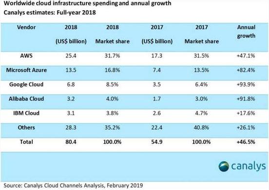 Synergy Research Group 的數據顯示,全球 Q4 云基礎設施服務(wù)支出整體比上一年同期增長(cháng)了 45 %,2018 年全年增長(cháng)率為 48 %。根據 Canalys 發(fā)布的全球云基礎設施支出和年增長(cháng)率的數據顯示,Google 不惜大刀闊斧搶占市場(chǎng),2018 年 Google 云基礎設施支出為 68 億美元排名第三,但是年支出增長(cháng)率最高遠超亞馬遜和微軟。