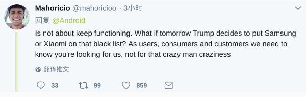 值得一提的是,華為被禁一事,似乎不僅國人在擔憂(yōu),比如 Android 賬號這條推特下有許多外國人都對該事件表示不解與反對。其中最熱的一條留言表示:“問(wèn)題的關(guān)鍵不是服務(wù)還能不能用。如果明天特朗普決定將三星或小米列入黑名單呢?作為用戶(hù)、消費者和客戶(hù),我們需要知道你們在乎的是我們的感受,而不是那個(gè)瘋子的。”