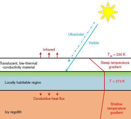 美國哈佛大學(xué)的 Robin Wordsworth 及同事在實(shí)驗室中復制了火星表面條件,并且表明2-3 厘米的氣凝膠層可以使火星表面溫度上升 50 °C。作者還利用火星氣候模型證實(shí),在富冰溫帶地區,氣凝膠可以使火星終年維持幾米深的液態(tài)水。此外,氣凝膠可以在傳播可見(jiàn)光的同時(shí)吸收紫外波段的光,這樣既能保護火星表面的環(huán)境,也能提供充足的光照支持光合作用。