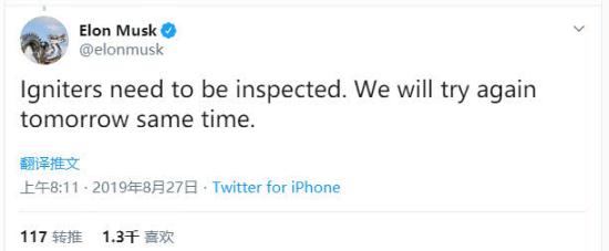 馬斯克隨后表示,點(diǎn)火器需要進(jìn)行檢查,將于明日再次進(jìn)行懸停測試。