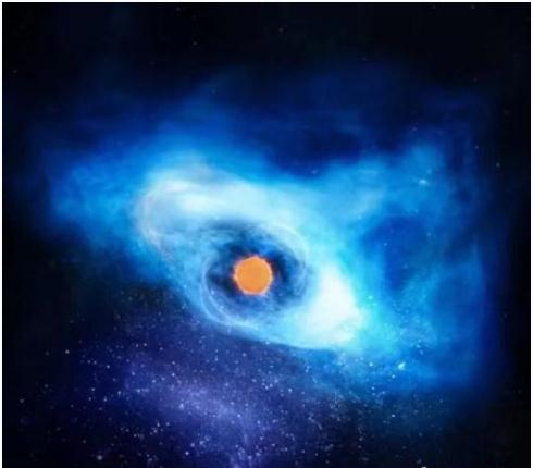 脈沖星及脈沖星風(fēng)云系統的示意圖,中間的橙色部分代表脈沖星(僅為示意繪制,天體大小不反映實(shí)際比例)。