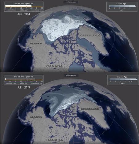 美國宇航局日前發(fā)布了北極冰層的動(dòng)態(tài)變化圖,顯示北極海冰在1984年至2019年間的變化。從圖像中可以看到,北極海冰在急劇減少。