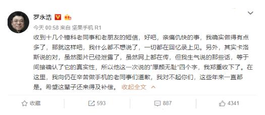 羅永浩的轉發(fā)也從側面證實(shí)了這款手機真實(shí)性非常高,恐怕是因為羅永浩的轉發(fā)帶來(lái)的影響,導致在10月9日凌晨,羅永浩發(fā)文向錘子科技的老同事道歉。