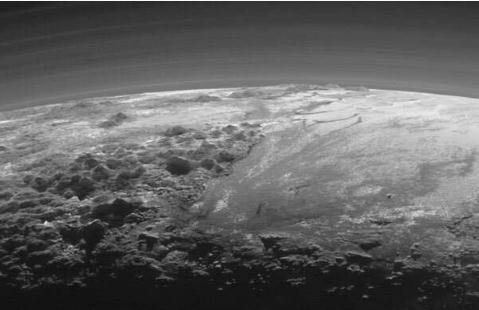 冥王星的諾蓋山脈(左側前景)、希拉里山脈(左側天際線(xiàn))和史波尼克高原(右側)的景象,可見(jiàn)大氣中彌漫的煙霧