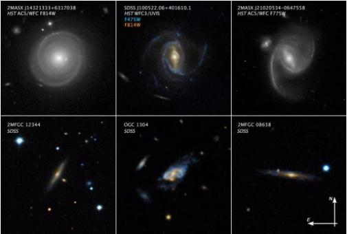一些超旋渦星系。Credit: NASA/ESA/P. Ogle/J. DePasquale (STSI)(上排);SDSS/P. Ogle/J. DePasquale (STSI)(下排)