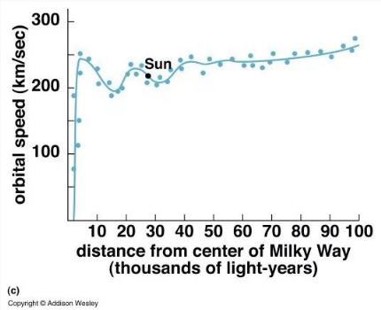 銀河系的旋轉速度曲線(xiàn)。與恒星系等系統不同,在星系中,除了非??拷诵牡膮^域外,任一半徑上的旋轉線(xiàn)速度是相當的。圖中橫坐標是到銀心的距離(單位:光年),縱坐標是旋轉線(xiàn)速度(單位:千米/秒)。Credit: Addison Wesley/University of Arizona