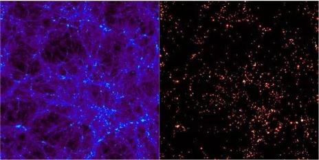 宇宙在第 30 億年左右時(shí)的暗物質(zhì)分布,由星系形成的數值模型給出。Credit: VIRGO Consortium/Alexandre Amblard/ESA
