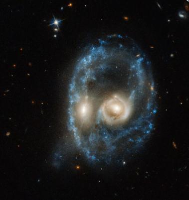 這個(gè)星系被稱(chēng)為 Arp-Madore 2026-424,它位于 7.04 億光年以外。正面碰撞導致產(chǎn)生了異常的環(huán)形形狀。歐空局(ESA)表示說(shuō): “環(huán)狀星系很罕見(jiàn),只有幾百個(gè)存在于我們更大的宇宙社區。” NASA 和 ESA 共同運營(yíng)哈勃望遠鏡。