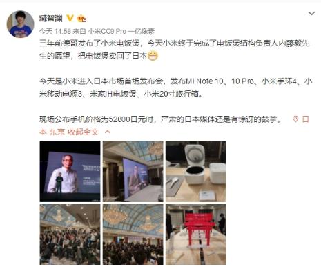 12 月 9 日,小米正式進(jìn)入日本市場(chǎng),一口氣發(fā)布了五個(gè)品類(lèi)六款產(chǎn)品,其中主打明星自然是小米 Note 10(小米 CC9 Pro),但是令小米最自豪的,其實(shí)是那個(gè)不起眼的電飯煲。