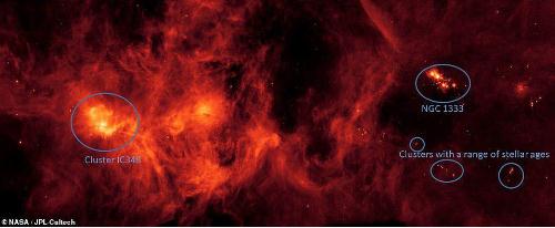 英仙座分子云位于英仙座的邊緣,其中含有大量新生的恒星,包含了超過(guò) 10000 個(gè)太陽(yáng)質(zhì)量的氣體和塵埃。從這些氣體和恒星發(fā)出的紅外光是人眼看不見(jiàn)的,但斯皮策望遠鏡可以捕捉到溫暖天體的圖像。
