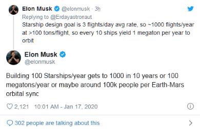 看起來(lái)馬斯克可不只是把送幾位勇敢的宇航員到火星,他的規劃可比這個(gè)大多了--將一整個(gè)國家的人送上去。馬斯克在推文中寫(xiě)道,一年建造 100 艘星際飛船,那么 10 年就可以建造 1000 艘或一年的運力可達 1 億噸,或者每次地球和火星軌道同步時(shí)可以將 10 萬(wàn)左右的人送上火星。