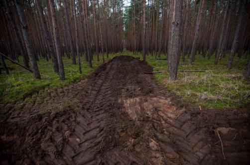 施工車(chē)輛的輪胎踏痕攪起了森林的地面。