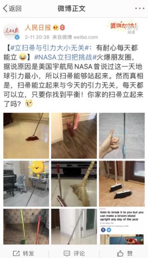 實(shí)際上 NASA 并未說(shuō)過(guò)這件事,可能是網(wǎng)友因為太無(wú)聊而想起的話(huà)題。另外國外媒體網(wǎng)友也在傳播#NASA 立掃把挑戰#。