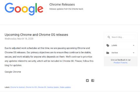 谷歌今日發(fā)公告稱(chēng),將暫時(shí)中斷 Chrome 和 Chrome OS 的版本更新,并優(yōu)先考慮安全和穩定性。