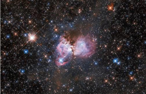 在最新公布的圖像(經(jīng)過(guò)處理)中,云團以粉紅色出現,年輕的星星在它周?chē)W耀。