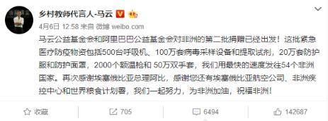 此前在 4 月 6 日,馬云公益基金會(huì )和阿里巴巴公益基金會(huì )對非洲的第二批捐贈出發(fā),包括500 臺呼吸機、100 萬(wàn)套病毒采樣設備和提取試劑、20 萬(wàn)套防護服和防護面罩、2000 個(gè)額溫槍、50 萬(wàn)雙手套,以最快的速度發(fā)往 54 個(gè)非洲國家。