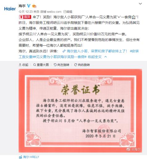 5 月 21 日上午,四川省富順縣,海爾成套服務(wù)工程師胡云川徒手爬樓,救下懸在六樓窗戶(hù)外的女童。為弘揚其見(jiàn)義勇為精神、傳遞正能量,海爾智家做出嘉獎決定: