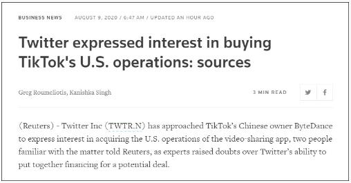 推特對于合并 TikTok 表現出興趣路透社