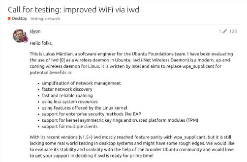 Ubuntu 開(kāi)發(fā)人員正在考慮使用 Intel IWD 作為 iNET 無(wú)線(xiàn)守護程序,以期取代 WPA_Supplicant,提供更好的 WiFi 體驗。