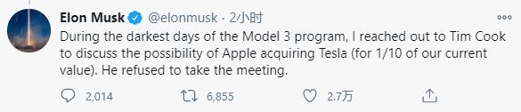 馬斯克在推文中表示,在公司開(kāi)發(fā)特斯拉 Model 3 的“最黑暗日子”里,自己曾聯(lián)系蘋(píng)果商討收購特斯拉的可行性。馬斯克表示,他想要以約600 億美元的估值將特斯拉賣(mài)給蘋(píng)果,這僅為當前特斯拉市值的十分之一。