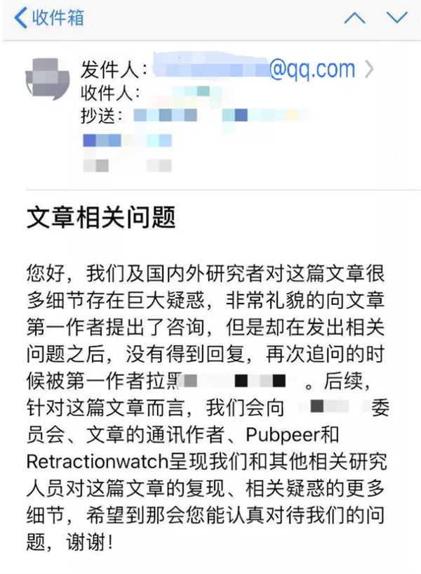 更有甚者,匿名者被一個(gè)作者拉黑后,就威脅其他合作者或作者單位的其他人。這樣不成功,再換個(gè) “馬甲” 甚至幾個(gè) “馬甲”,把這個(gè)過(guò)程再來(lái)一遍。例如,一位朋友告訴我,他的團隊收到過(guò)來(lái)自不同匿名者的郵件,這些郵件除了郵件地址之外,郵件內容竟然一字不差!