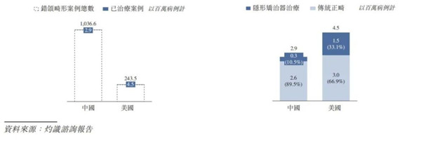 2019年,在中國經(jīng)治療的2.9百萬(wàn)例錯頜畸形病例中,僅10.5%采用隱形矯治器治療,而在美國經(jīng)治療的4.5百萬(wàn)例錯頜畸形病例中,33.1%采用隱形矯治器治療,其中的差異進(jìn)一步表明中國隱形矯治市場(chǎng)滲透率較低的事實(shí)。