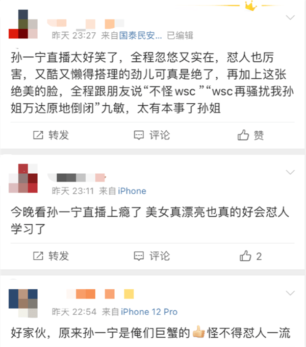 在昨晚的直播里,孫一寧也始終沒(méi)什么夸張的表情,直面網(wǎng)友的負面留言和調侃,來(lái)一個(gè)懟一個(gè)。