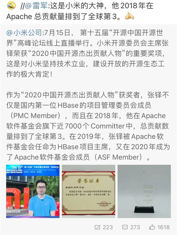 張鐸還在2020年榮獲了中國開(kāi)源杰出人物,被作為小米技術(shù)立業(yè)的代表性人物和事件。