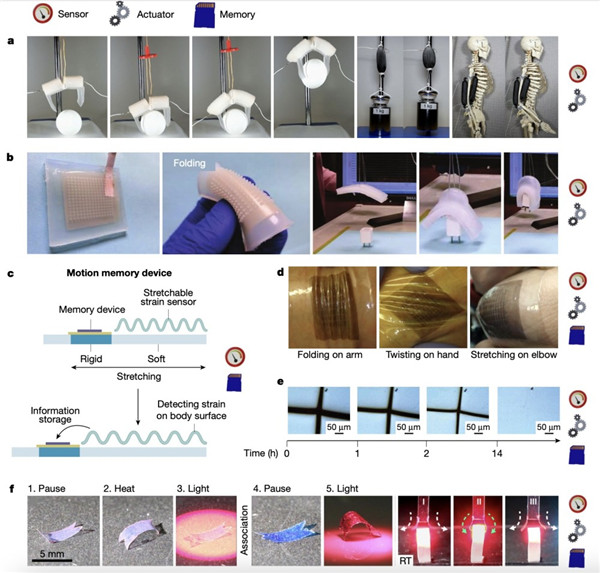 嵌入內存的軟物質(zhì),這一類(lèi)功能性軟物質(zhì)結合了物質(zhì)記憶和感知能力。有科學(xué)家在一種機械雜化材料中已驗證這一概念,其中電阻開(kāi)關(guān)器件作為剛性聚合光刻膠(SU-8)島上的存儲元件,該島嵌入可拉伸聚二甲基硅氧烷(PDMS)中,在聚二甲基硅氧烷上蒸發(fā)的金薄膜中的微裂紋同時(shí)起著(zhù)電極和應力傳感器的作用,這種運動(dòng)記憶裝置允許基于應力的變化和隨后的信息存儲來(lái)檢測人類(lèi)的四肢運動(dòng)。