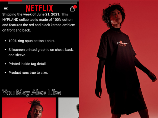 屏幕醒目地印著(zhù)“HYPLAND x YASUKE”,背景是新銳藝術(shù)家Jordan Bentley的照片。熟悉二次元潮牌的用戶(hù)可能會(huì )對HYPLAND有所了解,這個(gè)新興品牌正是由Jordan Bentley創(chuàng )立,此前最出名的系列是和死神、全職獵人、火影忍者、犬夜叉等經(jīng)典日本動(dòng)漫合作的商品。而YASUKE是奈飛在今年3月推出的全新動(dòng)畫(huà)。