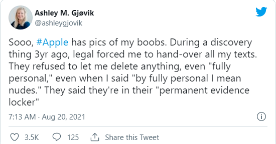 Gjøvik 表示,當其 3 月份開(kāi)始提出工作場(chǎng)所安全問(wèn)題時(shí),立即就面臨報復和恐嚇。她還表示面臨著(zhù)來(lái)自她的經(jīng)理和團隊成員的騷擾和欺凌。最近,她提出蘋(píng)果公司搜索和監視員工工作手機。她在推文中寫(xiě)道:“公司有我的裸照。在 3 年前的一次調查中,法律部門(mén)強迫我出示所有聊天記錄。就連那些完全私密的也不讓我刪除,甚至當我說(shuō)‘私人等于個(gè)人裸照’時(shí)他們也不為所動(dòng),還說(shuō)這些都在他們的 ‘永久證據柜’里。”