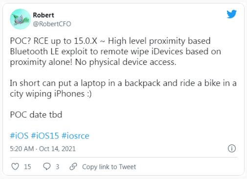 早前,一位安全研究人員發(fā)現并報告了一個(gè)遠程代碼執行漏洞,或允許攻擊者擦除所有 iOS 設備的漏洞。@RobertCFO 周三發(fā)推稱(chēng),其能夠利用這個(gè)可在近距離發(fā)起攻擊的低功耗藍牙漏洞,在無(wú)需訪(fǎng)問(wèn)的情況下擦除受影響 iPhone 和 iPad 設備,且后續還會(huì )提供概念驗證演示。