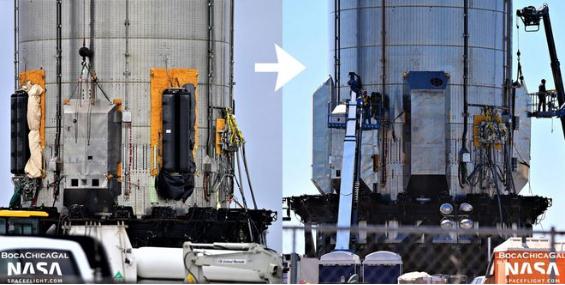 在安裝主要的 Aerocover 之前,SpaceX 還先安裝了至少六個(gè)小盒子,這應該是為了保護某些重要的金屬探測器,它們可以穿過(guò)超重型助推器的儲罐和外殼,并連接到了航空電子設備盒內部。此后,項目團隊還完成了 BN4 的猛禽發(fā)動(dòng)機熱屏蔽系統,使用了大量類(lèi)似的鋼板蓋和面板。