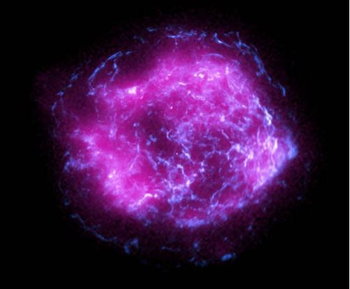 圖中,紫紅色與 IXPE 觀(guān)察到的X射線(xiàn)強度相對應,它覆蓋了來(lái)自 NASA 錢(qián)德拉X射線(xiàn)天文臺的高能X射線(xiàn)數據(藍色所示)。錢(qián)德拉天文臺 1999 年發(fā)射,被譽(yù)為“X射線(xiàn)領(lǐng)域的哈勃”,是當時(shí)最強大的X射線(xiàn)望遠鏡,它同樣對準銀河系內最年輕的超新星遺跡“仙后座A”拍下了第一張照片。