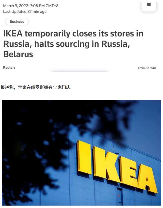 俄烏爆發(fā)沖突后,全球最大的家居品牌宜家3日發(fā)表聲明稱(chēng),將關(guān)閉其在俄羅斯的所有門(mén)店,并暫停從俄羅斯和白俄羅斯進(jìn)貨。