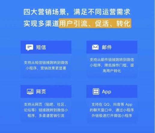 ……小程序還有哪些可突破的點(diǎn),是否值得創(chuàng )業(yè)者或者傳統企業(yè)入局?小程序與外部生態(tài),全渠道獲客結合近期微信生態(tài)能力升級內容,小程序正在不斷拓展互聯(lián)網(wǎng)邊界,流量也不僅限于微信生態(tài)內,這或許可以給到小程序商家更多的運營(yíng)空間和可能性。2021 年初,微信支持短信、郵件、app、網(wǎng)頁(yè)外部鏈接跳轉到微信小程序,基于該開(kāi)放能力,商家可全渠道向目標用戶(hù)推送活動(dòng)消息,用戶(hù)點(diǎn)擊鏈接直達小程序平臺,了解詳情。整個(gè)過(guò)程降低了用戶(hù)的使用門(mén)檻,最大化提高營(yíng)銷(xiāo)內容的轉化效果。