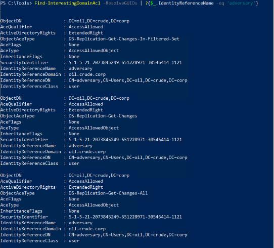 上述查詢(xún)中提到的 GUID 是執行 DCSync 攻擊所需的 Replication 權限的 GUID。