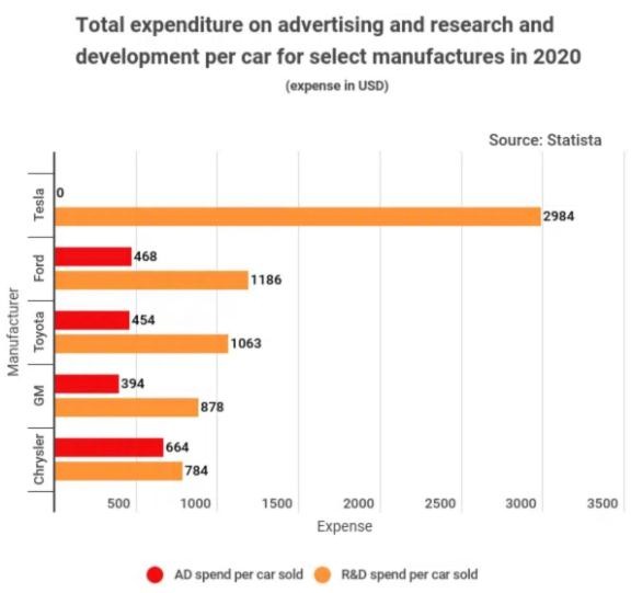 特斯拉的研發(fā)費用高于其他汽車(chē)廠(chǎng)商。StockApps.com 的數據顯示,每輛特斯拉汽車(chē)的研發(fā)費用為 2984 美元(約合人民幣 18990 元),是汽車(chē)產(chǎn)業(yè)平均水平的 3 倍,比福特、通用汽車(chē)和克萊斯勒研發(fā)費用(平均每輛車(chē))加在一起都高。